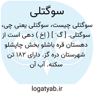 سوگتلی. [ گ َ ] ( اِخ ) دهی است از دهستان چری بخش حومه شهرستان قوچان. دارای 183 تن سکنه. آب آن از چشمه. محصول آنجا غلات است. ( از فرهنگ جغرافیائی ایران ج 9 ).