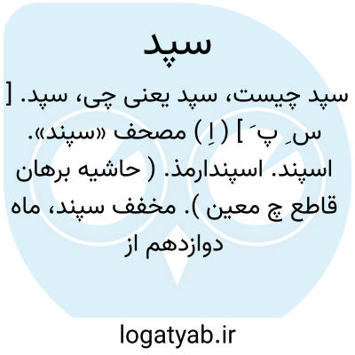 سپد. [ س ِ پ َ ] ( اِ ) مصحف «سپند». اسپند. اسپندارمذ. ( حاشیه برهان قاطع چ معین ). مخفف سپند، ماه دوازدهم از سالهای شمسی. ( برهان )( آنندراج ). || نام روز پنجم است از ماههای شمسی، در این روز فارسیان عید کنند و جشن سازند بنابر قاعده کلیه که نزد ایشان معتبر است که چون نام ماه و روز موافق آید آن روز را عید کنند و جشن سازند. نیک است به اعتقاد ایشان درین روز درخت نشاندن و نو پوشیدن. ( برهان ). || زمین که بعربی ارض گویند. ( برهان ) ( آنندراج ). || سپند را نیزگفته اند و آن تخمی باشد که بجهت چشم زخم در آتش کنند. ( برهان ) ( آنندراج ). || ( اِخ ) نام ملکی است موکل زمین. ( برهان ). ملک موکل زمین. ( آنندراج ).