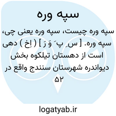 سپه وره. [ س ِ پ َ وَ رَ ] ( اِخ ) دهی است از دهستان تیلکوه بخش دیواندره شهرستان سنندج واقع در 52 هزارگزی باختر دیواندره و 7 هزارگزی شمال شوسه سنندج به سقز. هوای آنجا سردو دارای 95 تن سکنه است. آب آنجا از چشمه تأمین میشود. محصول آنجا توتون، غلات، حبوب، روغن، پشم و شغل اهالی زراعت و صنایع دستی آنها جاجیم بافی و راه آنجامالرو می باشد. ( از فرهنگ جغرافیایی ایران جلد 5 ).
