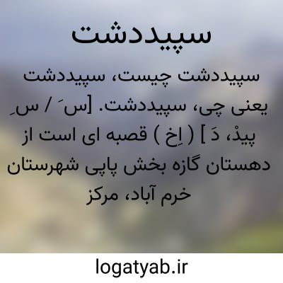 سپیددشت. [س َ / س ِ پیدْ، دَ ] ( اِخ ) قصبه ای است از دهستان گازه بخش پاپی شهرستان خرم آباد، مرکز بخش پاپی و ایستگاه راه آهن. در 108 هزارگزی جنوب خاوری شهرستان خرم آباد واقع گردیده است. موقعیت آن کوهستانی و هوای آن معتدل است. در حدود 600 تن سکنه دارد. آب آنجا از رودخانه سزار و چشمه چاله چنار تأمین میشود. محصول آن غلات. شغل اهالی زراعت، کارگری و کارمندی راه آهن،عده ای کسب میکنند، اداره بخشداری بخش پاپی در این قصبه واقع است. پاسگاه ژاندارمری، دبستان و در حدود 40 باب دکان دارد. ( از فرهنگ جغرافیایی ایران ج 6 ).