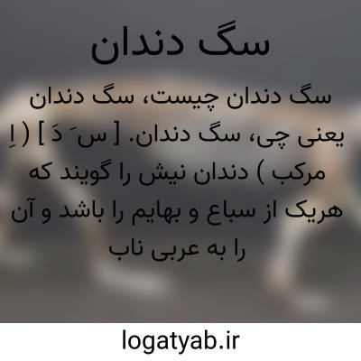 سگ دندان. [ س َ دَ ] ( اِ مرکب ) دندان نیش را گویند که هریک از سباع و بهایم را باشد و آن را به عربی ناب گویند. ( آنندراج ) ( انجمن آرای ناصری ). دندان نیش که هریک از سباع و بهایم را میباشد. و همچنین مار نیز هست که بدان دندان نیش میزند و آن را به تازی ناب میگویند. ( از برهان ).