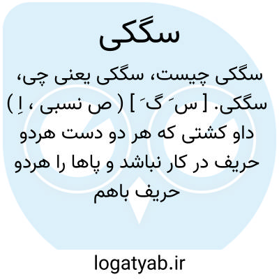 سگکی. [ س َ گ َ ] ( ص نسبی، اِ ) داو کشتی که هر دو دست هردو حریف در کار نباشد و پاها را هردو حریف باهم بند کرده هریکی بسوی خود کشند مثل بندشدن سگ با ماده. ( از غیاث ). نام فنی از کشتی و آن دو قسم است یکی سگکی واژونه که دستهای حریف در کار نباشد و پاها باهم بند کرده یکدیگر را بکشند و بند کنند و زور کنند. دوم سگکی روبرو که دستها و پاها باهم بند کنند مثل بند شدن دو سگ. ( آنندراج ):