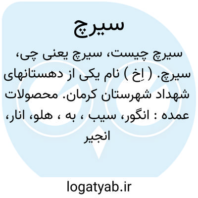 سیرچ. ( اِخ ) نام یکی از دهستانهای شهداد شهرستان کرمان. محصولات عمده: انگور، سیب، به، هلو، انار، انجیر میباشد که بخوبی معروف است. این دهستان از 15 آبادی بزرگ و کوچک تشکیل شده و جمعیت آن در حدود 1679 تن است. مرکز دهستان قصبه سیرچ است که مرکز دهستان است و دارای 1539 تن سکنه است. آب آن از رودخانه و چشمه است. محصول آن میوه جات، غلات و میوه آن بخوبی مشهور است. مزارع چنارسوخته، کلکوئیه پائین و بالا و بامزارجزء این ده است. ( از فرهنگ جغرافیائی ایران ج 8 ).