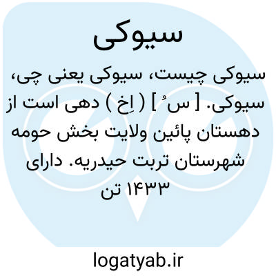 سیوکی. [ س ُ ] ( اِخ ) دهی است از دهستان پائین ولایت بخش حومه شهرستان تربت حیدریه. دارای 1433 تن سکنه. آب آن از قنات. محصول آن غلات، پنبه. شغل اهالی آنجا زراعت، گله داری و کرباس بافی است. از قلعه نو میتوان اتومبیل برد. ( از فرهنگ جغرافیائی ایران ج 9 ).
