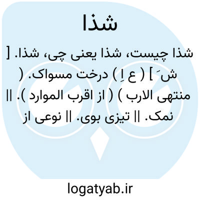 شذا. [ ش َ ] ( ع اِ ) درخت مسواک. ( منتهی الارب ) ( از اقرب الموارد ). || نمک. || تیزی بوی. || نوعی از کشتی. || مگس سگ یا عام است. ( منتهی الارب ) ( از اقرب الموارد ). شذاة؛ یک مگس. ( منتهی الارب ). || گزند و رنج. ( منتهی الارب ). شر. ( از اقرب الموارد ) ( منتهی الارب ). || چوب پاره ها. ( منتهی الارب ) ( از اقرب الموارد ). || ( اِمص ) خارش. ( منتهی الارب ). جرب.( اقرب الموارد ). حکه. ( ناظم الاطباء ). || شدت. ( منتهی الارب ) ( ناظم الاطباء ). || شدت گرسنگی. ( منتهی الارب ) ( از اقرب الموارد ). ج، شذاة.
