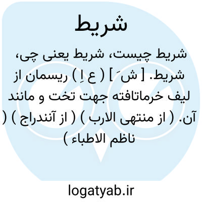 شریط. [ ش َ ] ( ع اِ ) ریسمان از لیف خرماتافته جهت تخت و مانند آن. ( از منتهی الارب ) ( از آنندراج ) ( ناظم الاطباء ) ( از اقرب الموارد ). رسن. ( مهذب الاسماء ). شریت. آنچه چارواداران بغلط شلید گویند برای بستن کجاوه. ( یادداشت مؤلف ). رجوع به شریت شود.