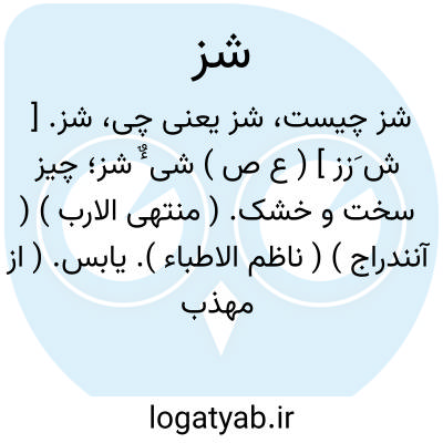شز. [ ش َزز ] ( ع ص ) شی ٌٔ شز؛ چیز سخت و خشک. ( منتهی الارب ) ( آنندراج ) ( ناظم الاطباء ). یابس. ( از مهذب الاسماء ). رجوع به شَزیز شود.