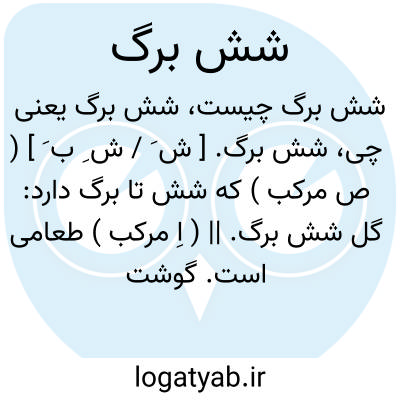 شش برگ. [ ش َ / ش ِ ب َ ] ( ص مرکب ) که شش تا برگ دارد: گل شش برگ. || ( اِ مرکب ) طعامی است. گوشت سرخ کرده پیچیده در خمیر گسترده. ( یادداشت مؤلف ). خمیری که در آن گوشت پخته نهند. ( از تذکره داود ضریر انطاکی ).