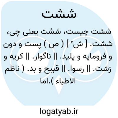ششت. [ ش ُ ] ( ص ) پست و دون و فرومایه و پلید. || ناگوار. || کریه و زشت. || رسوا. || قبیح و بد. ( ناظم الاطباء ).اما این معنی و معانی قبلی کلمه مخصوص این فرهنگ است و در فرهنگهای دیگر که در دسترس بود، دیده نشده.
