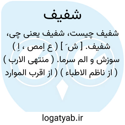 شفیف. [ ش َ ] ( ع اِمص، اِ ) سوزش و الم سرما. ( منتهی الارب ) ( از ناظم الاطباء ) ( از اقرب الموارد ). || خنکی: فلان یجد فی اسنانه شفیفا؛ فلان در دندانهای خود احساس سردی و خنکی میکند. || شدت گرمی آفتاب ( از اضداد است ). ( از اقرب الموارد ) ( ناظم الاطباء ). || اندک از هر چیزی. || باران باسرما. ( از منتهی الارب ) ( ناظم الاطباء ) ( از اقرب الموارد ). || درد. ( از اقرب الموارد ). || ( ص ) باد سرد و خنک. ( منتهی الارب ) ( از ناظم الاطباء ) ( از اقرب الموارد ). || رقیق و شفاف. ( ناظم الاطباء ):