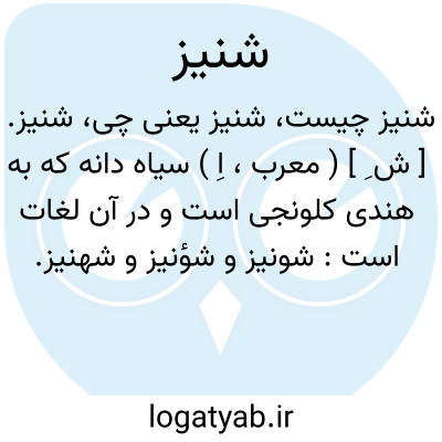 شنیز. [ ش ِ ] ( معرب، اِ ) سیاه دانه که به هندی کلونجی است و در آن لغات است: شونیز و شؤنیز و شهنیز. فارسی الاصل است. ( منتهی الارب ). شونیز و شینیز سیاه دانه است.( از اقرب الموارد ). و رجوع به شُنیز و شونیز شود.