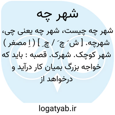 شهرچه. [ ش َ چ َ / چ ِ ] ( اِ مصغر ) شهر کوچک. شهرک. قصبه: باید که خواجه بزرگ بمیان کار درآید و درخواهد از خداوند سلطان تا این شهرچه ها که به اطراف بیابان است چون مرو و سرخس و باورد ما را داده آید. ( تاریخ بیهقی چ ادیب ص 514 ).