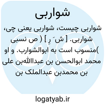 شواربی. [ ش َ رِ ] ( ص نسبی )منسوب است به ابوالشوارب. و او محمد ابوالحسن بن عبداﷲبن علی بن محمدبن عبدالملک بن ابوالشوارب بغدادی است و در سال 328 هَ. ق. درگذشت. ( از انساب سمعانی ).