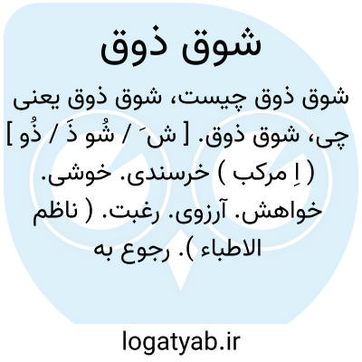 شوق ذوق. [ ش َ / شُو ذَ / ذُو ] ( اِ مرکب ) خرسندی. خوشی. خواهش. آرزوی. رغبت. ( ناظم الاطباء ). رجوع به شوق و ذوق شود.