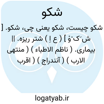 شکو. [ ش َک ْوْ ] ( ع اِ ) شتر ریزه. || بیماری. ( ناظم الاطباء ) ( منتهی الارب ) ( آنندراج ) ( اقرب الموارد ). || گله. ( ناظم الاطباء ) ( منتهی الارب ) ( آنندراج ). ناله. ( ناظم الاطباء ).