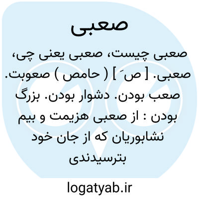 صعبی. [ ص َ ] ( حامص ) صعوبت. صعب بودن. دشوار بودن. بزرگ بودن: از صعبی هزیمت و بیم نشابوریان که از جان خود بترسیدندی در آن رزان و باغها خود راافکندند. ( تاریخ بیهقی چ ادیب ص 436 ). یا بسبب صعبی درد، قوت آن اندام ساقط شود. ( ذخیره خوارزمشاهی ).