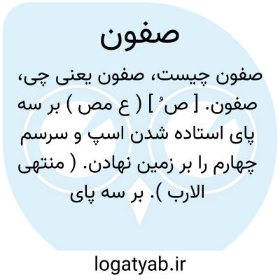 صفون. [ ص ُ ] ( ع مص ) بر سه پای استاده شدن اسپ و سرسم چهارم را بر زمین نهادن. ( منتهی الارب ). بر سه پای ایستادن اسب و بر کناره سم چهارم. ( ترجمان علامه جرجانی ). قدم بهم باز نهادن و بر سه پای ایستادن اسب و بر کناره سم چهارم. ( تاج المصادر بیهقی ). || صف بستن مرد به هر دو پای خویش. ( منتهی الارب ). || زدن کسی را بر زمین. ( منتهی الارب ).