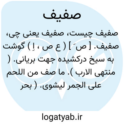 صفیف. [ ص َ ] ( ع ص، اِ ) گوشت به سیخ درکشیده جهت بریانی. ( منتهی الارب ). ما صف من اللحم علی الجمر لیشوی. ( بحر الجواهر ). گوشت نمک سوده. ( مهذب الاسماء ). گوشت که بر ریگ تافته بریان کنند. || چیزی که در آفتاب گذارند تا خشک شود یا بر خدرک آتش نهند تا کباب گردد. ( منتهی الارب ). ما صف فی الشمس لیجف. ( اقرب الموارد ). || ( اِمص ) آرام و سکون بال پرندگان بهنگام پریدن.