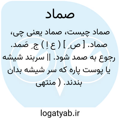صماد. [ ص ِ ] ( ع اِ ) ج ِ صَمد. رجوع به صمد شود. || سربند شیشه یا پوست پاره که سر شیشه بدان بندند. ( منتهی الارب ). غلاف شیشه. ( مهذب الاسماء ). || خرقه یا مندیل که مردم بر سر پیچند جز عمامه. ( منتهی الارب ).