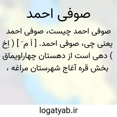 صوفی احمد. [ اَ م َ ] ( اِخ ) دهی است از دهستان چهاراویماق بخش قره آغاج شهرستان مراغه، واقع در 35 هزاروپانصد گزی خاور قره آغاج و 32 هزارگزی جنوب شوسه مراغه به میانه. این دهکده کوهستانی و هوای آن معتدل و مالاریائی است. 185 تن سکنه دارد. آب آن از رودخانه آیدوغموش. محصول آن غلات، برنج. شغل اهالی زراعت و صنایع دستی آنان جاجیم بافی است. راه دهکده مالرو است. ( از فرهنگ جغرافیائی ایران ج 4 ).