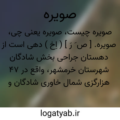 صویره. [ ص َ رَ ] ( اِخ ) دهی است از دهستان جراحی بخش شادگان شهرستان خرمشهر، واقع در 47 هزارگزی شمال خاوری شادگان و کنار راه اتومبیل رو خلف آباد به شادگان. این دهکده در دشت واقع و گرمسیری و مالاریایی است. 150تن سکنه دارد. آب آن از رودخانه جراحی. محصول آنجاغلات. شغل اهالی زراعت و گله داری است. ساکنین از طایفه عساکره هستند. ( از فرهنگ جغرافیائی ایران ج 6 ).