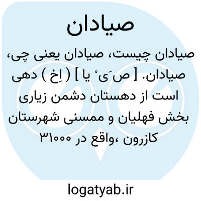 صیادان. [ ص َی ْ یا ] ( اِخ ) دهی است از دهستان دشمن زیاری بخش فهلیان و ممسنی شهرستان کازرون،واقع در 31000 گزی جنوب خاور فهلیان و 25000 گزی شوسه کازرون به فهلیان. کوهستانی و هوای آن معتدل و مالاریائی است. 75 تن سکنه دارد. آب آن از چشمه. محصول آنجا غلات و حبوبات. شغل اهالی زراعت و گلیم بافی است. راه مالرو دارد. ( از فرهنگ جغرافیائی ایران ج 7 ).