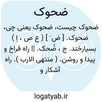 ضحوک. [ ض َ ] ( ع ص، اِ ) بسیارخند. ج، ضُحک. || راه فراخ و پیدا و روشن. ( منتهی الارب ). راه آشکار و فراخ. ( منتخب اللغات ). راه روشن. ( مهذب الاسماء ).