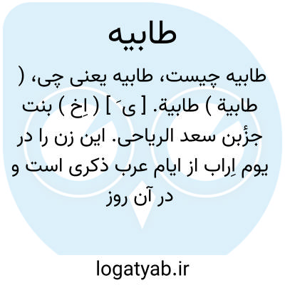 ( طابیة ) طابیة. [ ی َ ] ( اِخ ) بنت جزٔبن سعد الریاحی. این زن را در یوم اِراب از ایام عرب ذکری است و در آن روز اسیر شد و پدرش مالی بعنوان سربها داد و او را آزاد ساخت. ( عقدالفرید، ج 6 ص 93 ).