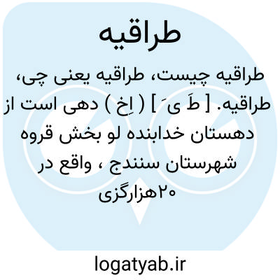 طراقیه. [ طَ ی َ ] ( اِخ ) دهی است از دهستان خدابنده لو بخش قروه شهرستان سنندج، واقع در 20هزارگزی شمال خاور گز تپه و 8هزارگزی خاور علی سرد. تپه ماهور، سردسیر با 800 تن سکنه. آب آن از چشمه و قنات. محصولات آنجا غلات، انگور، صیفی، لبنیات و حبوبات. شغل اهالی زراعت و گله داری. راه آن مالرو است و در تابستان از طریق گل تپه و سراب و کبودرآهنگ اتومبیل میتوان برد. قلعه قدیمی دارد. دوکیلومتری باغ معروف به باغ وزیرجزء این ده است. ( از فرهنگ جغرافیائی ایران ج 5 ).