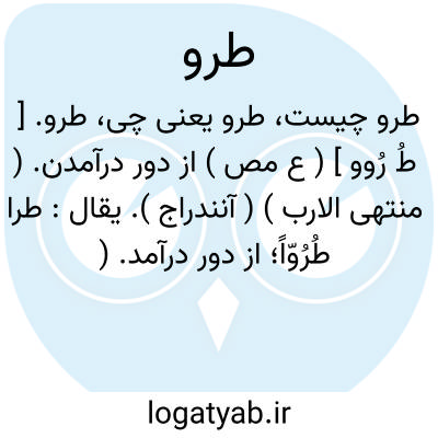 طرو. [ طُ رُوو ] ( ع مص ) از دور درآمدن. ( منتهی الارب ) ( آنندراج ). یقال: طرا طُرُوّاً؛ از دور درآمد. ( منتهی الارب ). آمدن از جای دور. ( منتخب اللغات ).