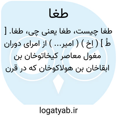 طغا. [ طُ ] ( اِخ ) ( امیر... ) از امرای دوران مغول معاصر کیخاتوخان بن ابقاخان بن هولاکوخان که در قرن هفتم میزیسته است. رجوع به تاریخ گزیده ص 590 شود.