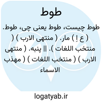 طوط. ( ع اِ ) مار. ( منتهی الارب ) ( منتخب اللغات ). || پنبه. ( منتهی الارب ) ( منتخب اللغات ) ( مهذب الاسماء ). قطن. ( فهرست مخزن الادویه ). || قطن بردی. لوئی. || ( ص ) مرد بلندبالا. ( منتهی الارب ). مرد دراز. ( مهذب الاسماء ). دراز. ( منتخب اللغات ). || ( اِ ) باشه. ( منتهی الارب ). || شب پره. ( منتهی الارب ) ( منتخب اللغات ). خفاش. || ( ص ) خُرد. ( منتهی الارب ) ( منتخب اللغات ). ریزه. || مرد سخت پیکار. ( منتهی الارب ). شدیدالخصومة. ( منتخب اللغات ). || دلیر. ( منتهی الارب ) ( منتخب اللغات ). || گشن تیزشهوت. ( منتهی الارب ). شتر مست و بیقرار برای گشنی. ( منتخب اللغات ). ج، اطواط.