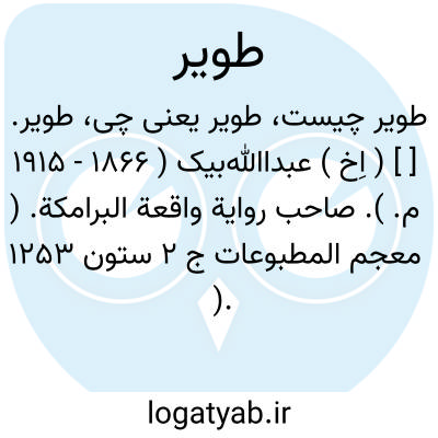 طویر. [ ] ( اِخ ) عبداﷲبیک ( 1866 - 1915 م. ). صاحب روایة واقعة البرامکة. ( معجم المطبوعات ج 2 ستون 1253 ).