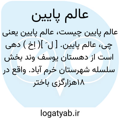 عالم پایین. [ ل َ ]( اِخ ) دهی است از دهستان یوسف وند بخش سلسله شهرستان خرم آباد. واقع در 18هزارگزی باختر الشتر و هفت هزارگزی باختر اتومبیل رو خرم آباد به کرمانشاه. ناحیه ای است واقع در جلگه هوای آن سرد و مالاریائی است. 120 تن سکنه دارد. آب آن از رودخانه رمزیار تأمین میشود محصولاتش غلات، حبوبات، لبنیات و اهالی، به کشاورزی و گله داری اشتغال دارند راه آن مالرو است. ساکنان از طایفه یوسف وندند. ( از فرهنگ جغرافیائی ایران ج 6 ).