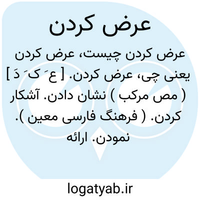 عرض کردن. [ ع َ ک َ دَ ] ( مص مرکب ) نشان دادن. آشکار کردن. ( فرهنگ فارسی معین ). نمودن. ارائه کردن. عرضه داشتن. عرضه کردن. معروض داشتن. پیش نهادن. تقدیم کردن. نمایش دادن. به معرض درآوردن: امیر فرمود تا زندانهای غزنی و آن نواحی عرض کنند. ( تاریخ بیهقی ص 273 ). بگیر از نفس خود پیمان...بهمراهی این آورنده نبشته و آنرا بر همه مردم خود عرض کن. ( تاریخ بیهقی ص 313 ). استادم چون نامه بخواندپیش امیر شد و نامه عرض کرد. ( تاریخ بیهقی ص 371 ).