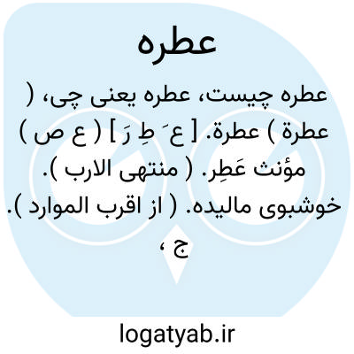 ( عطرة ) عطرة. [ ع َ طِ رَ ] ( ع ص ) مؤنث عَطِر. ( منتهی الارب ). خوشبوی مالیده. ( از اقرب الموارد ). ج، عَطِرات. ( اقرب الموارد ).