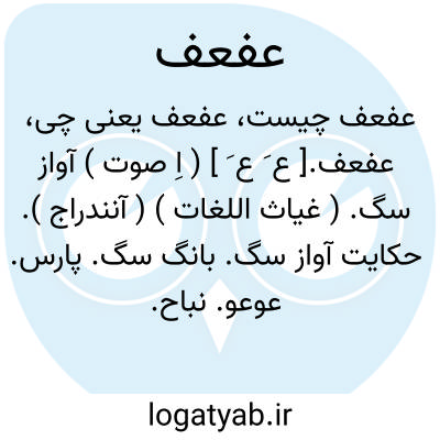 عفعف.[ ع َ ع َ ] ( اِ صوت ) آواز سگ. ( غیاث اللغات ) ( آنندراج ). حکایت آواز سگ. بانگ سگ. پارس. عوعو. نباح. واغ واغ. وعوع. وغواغ. وغوغ. هاف هاف. هفهف: