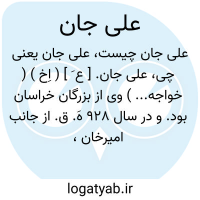 علی جان. [ ع َ ] ( اِخ ) ( خواجه... ) وی از بزرگان خراسان بود. و در سال 928 هَ. ق. از جانب امیرخان، با چند تن از بزرگان دیگر نزد طهماسب میرزا رفت. ( رجوع به حبیب السیر چ خیام ج 4 ص 594 شود ).، علیجان. [ ع َ ] ( اِخ ) دهی است از دهستان آتش بیک، بخش سراسکند شهرستان تبریز. واقع در 37 هزارگزی باختر سراسکند و 25 هزارگزی راه شوسه و خطآهن مراغه به میانه. ناحیه ای است کوهستانی و دارای آب و هوای معتدل و 448 تن سکنه. آب آن از چشمه و رودخانه تأمین می شود. و محصول آن غلات و حبوب است. اهالی به زراعت و گله داری اشتغال دارند. و راه آن مالرو است. ( از فرهنگ جغرافیایی ایران ج 4 ).