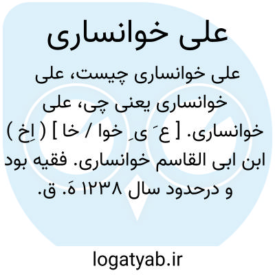 علی خوانساری. [ ع َ ی ِ خوا / خا ] ( اِخ ) ابن ابی القاسم خوانساری. فقیه بود و درحدود سال 1238 هَ. ق. درگذشت. او راست: شرح الدرة، که کامل نشده است. ( از معجم المؤلفین بنقل از اعیان الشیعه عاملی ج 41 ص 37 ).