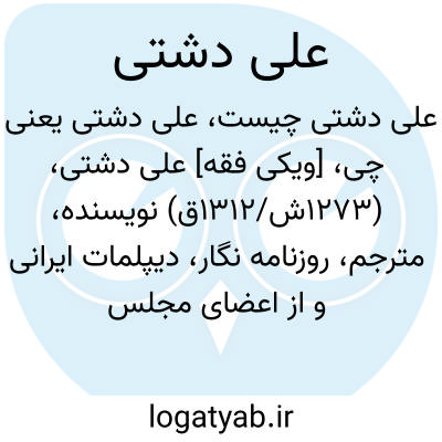 [ویکی فقه] علی دشتی، (۱۲۷۳ش/۱۳۱۲ق) نویسنده، مترجم، روزنامه نگار، دیپلمات ایرانی و از اعضای مجلس شورای ملی و مجلس سنای ایران در دوره پهلوی بود. سفارت دولت شاهنشاهی ایران در لبنان و مصر از مسئولیت های دیگر اوست. او پس از انقلاب اسلامی ایران، در سال ۱۳۵۷ دوبار به خاطر نوشتن کتاب بیست و سه سال زندانی شد و بعد از مدتی به دلیل کهولت و بیماری و شکستگی پا آزاد شد.