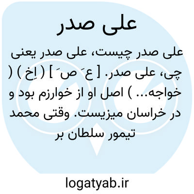 علی صدر. [ ع َ ص َ ] ( اِخ ) ( خواجه... ) اصل او از خوارزم بود و در خراسان میزیست. وقتی محمد تیمور سلطان بر خراسان مسلط شد برخی از متعصبان اهل سنت شروع به اذیت و آزار شیعیان کردند و فتنه ها برپا ساختند تا اینکه این خواجه علی صدر بنا به درخواست امیر غیاث الدین محمدبن امیریوسف، به محمد تیمور سلطان گوشزد کرد که این اعمال موجب فتنه و تخریب مملکت میشود و بدین ترتیب دستور منع آزار شیعیان صادر شد. ( از حبیب السیر چ خیام ج 4 ص 533 ).