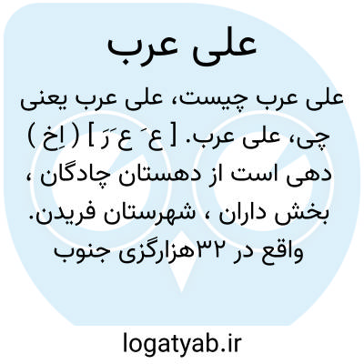 علی عرب. [ ع َ ع َرَ ] ( اِخ ) دهی است از دهستان چادگان، بخش داران، شهرستان فریدن. واقع در 32هزارگزی جنوب خاوری داران، و 12هزارگزی جاده کوهرنگ. ناحیه ای است کوهستانی و سردسیر، و دارای 327 تن سکنه. آب آن از چشمه تأمین میشود و محصول آن غلات آبی و دیمی است. اهالی به زراعت اشتغال دارند. و صنایع دستی زنان کرباس بافی است. راه آن مالرو است. ( از فرهنگ جغرافیایی ایران ج 10 ).