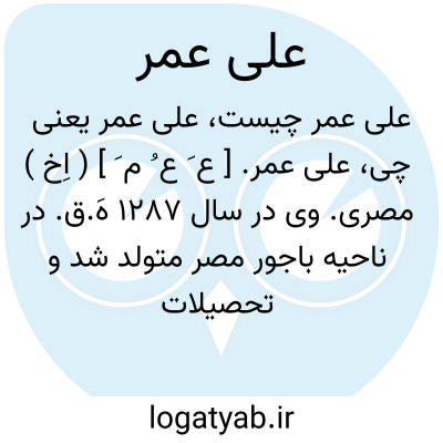 علی عمر. [ ع َ ع ُ م َ ] ( اِخ ) مصری. وی در سال 1287 هَ.ق. در ناحیه باجور مصر متولد شد و تحصیلات خود را در قاهره و انگلستان بپایان رساند و مشغول امور تعلیم و تربیت شد و بر اثر شرکتش در یک جنبش ملی، به رفح تبعید شد و پس از بازگشت بازرس وزارت فرهنگ گردید. ودر سال 1349 هَ. ق. در قاهره درگذشت. او راست: هدایةالمدرس. و نیز در تألیف القراءة الرشیدة شرکت داشت. ( از معجم المؤلفین از الاعلام زرکلی ج 5 ص 132 ).
