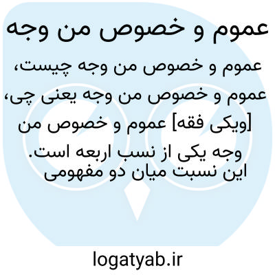 [ویکی فقه] عموم و خصوص من وجه یکی از نسب اربعه است. این نسبت میان دو مفهومی برقرار است که در برخی مصادیق همپوشانی و اشتراک دارند، لکن هر یک دارای مصادیقی است که به خود آن اختصاص دارد. اگر دو مفهوم سیاه و پرنده ملاحظه شوند چنین نسبتی میان­شان وجود دارد. برخی از مصادیق وجود دارد که هم سیاه است و هم پرنده، همانند کلاغ؛ ولی برخی از پرنده­ ها مانند کبوتر، سیاه نیستند، چنان که برخی از سیاه ها همانند ذغال نیز پرنده نیستند. بازگشت نسبت عام و خاص من وجه به یک موجبه جزئیه و دو سالبه جزئیه است. مانند: "بعضی سیاه ها پرنده اند" و "بعضی پرنده ها سیاه نیستند" و "بعضی سیاه ها پرنده نیستند".
