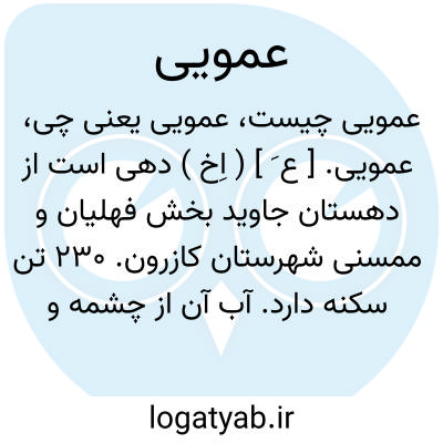 عمویی. [ ع َ ] ( اِخ ) دهی است از دهستان شاپور بخش مرکزی شهرستان کازرون. 190 تن سکنه دارد. آب آن از رودخانه شاپور و محصول آن غلات و صیفی است. ( از فرهنگ جغرافیائی ایران ج 7 ).