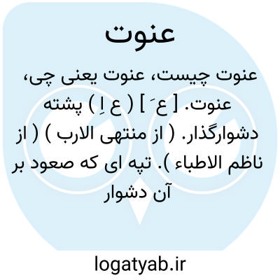 عنوت. [ ع َ ] ( ع اِ ) پشته دشوارگذار. ( از منتهی الارب ) ( از ناظم الاطباء ). تپه ای که صعود بر آن دشوار باشد. ( از اقرب الموارد ). عُنتوت. رجوع به عنتوت شود.