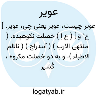 عویر. [ ع ُ وَ ] ( ع اِ ) خصلت نکوهیده. ( منتهی الارب ) ( آنندراج ) ( ناظم الاطباء ). و به دو خصلت مکروه، کُسَیر و عویر گویند. ( از اقرب الموارد ) ( از ناظم الاطباء ). || زاغ. ( منتهی الارب ) ( آنندراج ) ( ناظم الاطباء ). غراب، و آن را بجهت تیزبینی وی، از روی تشاؤم چنین نامیده اند. ( از اقرب الموارد ). || ( اِخ ) نام مردی است. ( منتهی الارب ) ( آنندراج ).