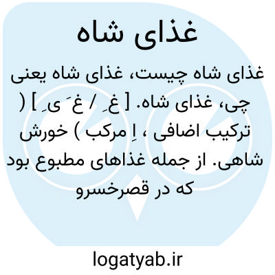 غذای شاه. [ غ ِ / غ َ ی ِ ] ( ترکیب اضافی، اِ مرکب ) خورش شاهی. از جمله غذاهای مطبوع بود که در قصرخسرو پرویز برای پادشاه ولاش مهیا می کردند و آن مرکب بود از گوشت گرم و گوشت سرد و برنج و برک معطر و مرغان مسمن و خبیص و طبرزد. ( از کتاب ایران در زمان ساسانیان چ 1317 هَ.ش. ص 338 و چ 1332 هَ.ش. ص 499 ).