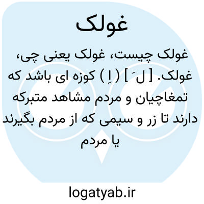 غولک. [ ل َ ] ( اِ ) کوزه ای باشد که تمغاچیان و مردم مشاهد متبرکه دارند تا زر و سیمی که از مردم بگیرند یا مردم بطریق نذر نهند در میان آن اندازند.( فرهنگ جهانگیری ). کوزه چرم کرده که تمغاچیان و محترفه زر در آن اندازند. ( فرهنگ رشیدی ). کوزگک سفالین یا صندوقچه ای فلزی که کودکان پول در آن ریزند و جمع کنند. غُلَّک. غوله. طَبل. کولک. قُلَّک. رجوع به برهان قاطع، انجمن آرا، آنندراج، غُلَّک و قلک شود. || راز و رمز و هر چیز پنهانی. ( ناظم الاطباء ).