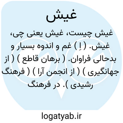 غیش. ( اِ ) غم و اندوه بسیار و بدحالی فراوان. ( برهان قاطع ) ( از جهانگیری ) ( از انجمن آرا ) ( فرهنگ رشیدی ). در فرهنگ شعوری شاهدی نیز آمده است. رجوع به همین فرهنگ ( ورق 187 الف ) شود. || هرچیز انبوه را گویند، مانند بیشه و جنگل و غیر آن. ( برهان قاطع ) ( از جهانگیری ). هرچه انبوه بود مانند بیشه و جز آن. ( از فرهنگ رشیدی ). انبوه بودن چیزی مانند بیشه و جنگل. ( انجمن آرا ) ( آنندراج ). اصل کلمه «وغیش » است که در شعر شاهد از اسدی و سوزنی خطا خوانده اند. رجوع به وغیش شود. ( حاشیه برهان قاطع چ معین ).